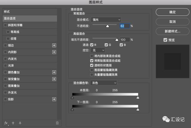 19.将图像层重命名为湿玻璃面板 。双击打开图层样式并选择混合选项。设置混合模式:强光和不透明度:62% 。单击确定确认。