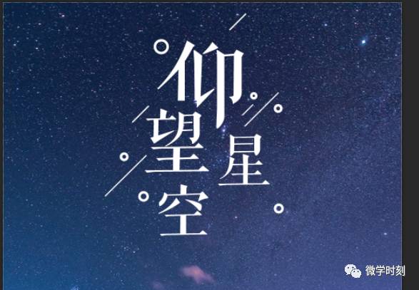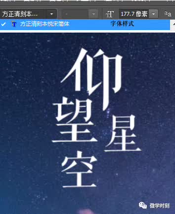 在接下来就是文字排版了,把我们的主题“仰望星空”打上,这里使用的是【方正清刻本锐宋简体】然后调整位置上下和左右错开。