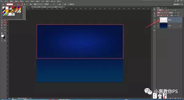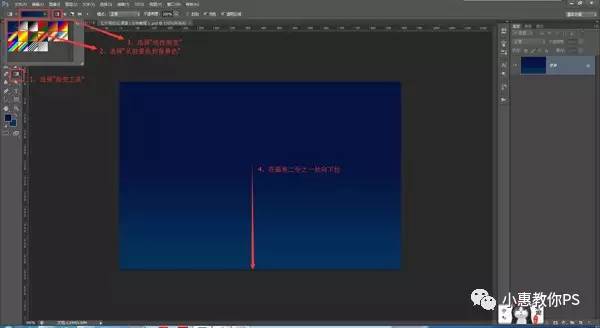 b) 选择“渐变工具”(快捷键:G),在属性栏点选“线性渐变”,将渐变方式设置为“从前景色到背景色”,在画布二分之一处向下拉,绘制出夜空上深下浅的效果;