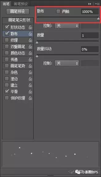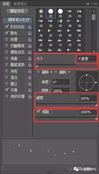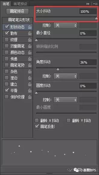 b) 选择“画笔工具”,将前景色调为“白色”,按F5键调出“画笔面板”,分别调整以下参数;