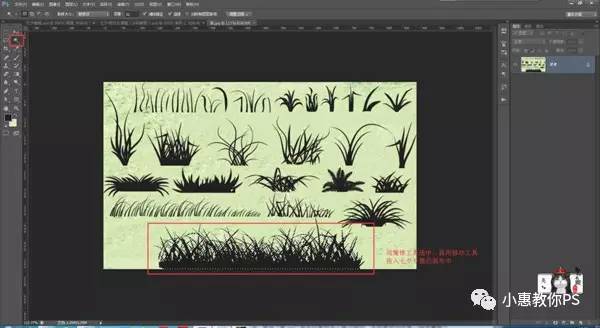 d) 再将“草.jpg”格式的素材导入新文档中,选取素材中的某一块用魔棒工具选出来,再用“移动工具”拖入画布中