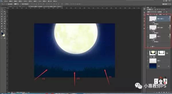 5、 在夜空中加入“月亮.jpg”素材;将其混合模式改为“滤色”;此时绝大部分的黑色都被去掉,但是图中任然存在以下情况: