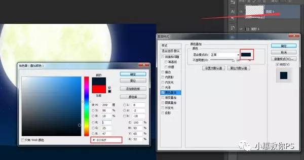 e)将草的素材导入后,先将其转换成智能对象(右击该图层,选择“转换为智能对象”)。颜色与其地面不匹配,下面来调整草的颜色,双击草的图层,调出图层样式面板,选择“颜色叠加”,将颜色改为“#01192f”