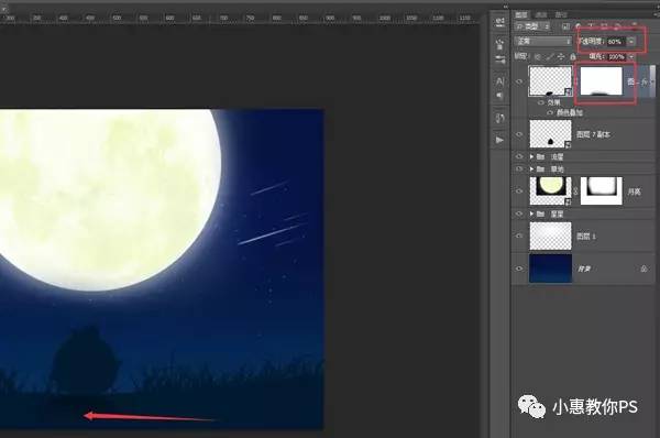 为了让影子自然一些,为添加一个图层蒙版,用黑色画笔对边缘进行适当的擦除,然后适当降低不透明度,此处图层设置为60%