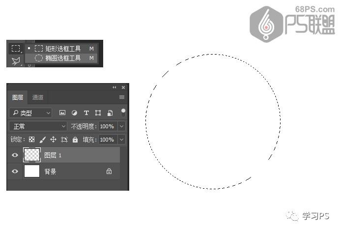步骤2、在图层面板中新建图层1,然后选择椭圆选框工具,按住Shift键在画布中间画一个圆。