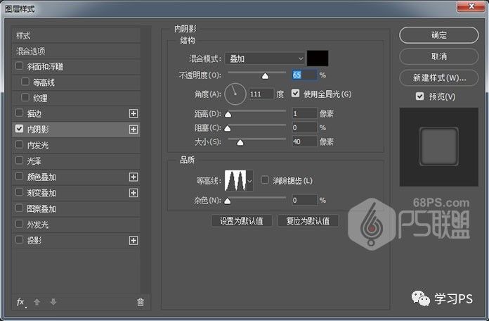 步骤4、转到图层面板双击图层1打开图层样式,下面我们来设置圆的内阴影,混合模式:叠加,不透明度:65%,距离:1,大小:40,等高线:环形-双。