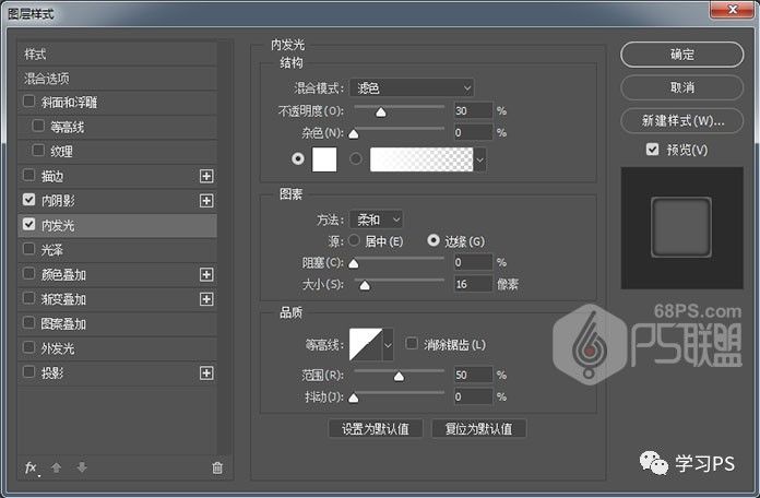 步骤5、设置内发光,使微章更有水晶的光泽。混合模式:滤色,不透明度:30%。