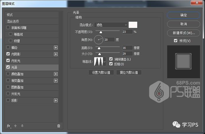 步骤6、设置光泽,使微章更有光泽感和立体感。混合模式:滤色,不透明度:23%,距离:16,大小:29,等高线:环形-双。