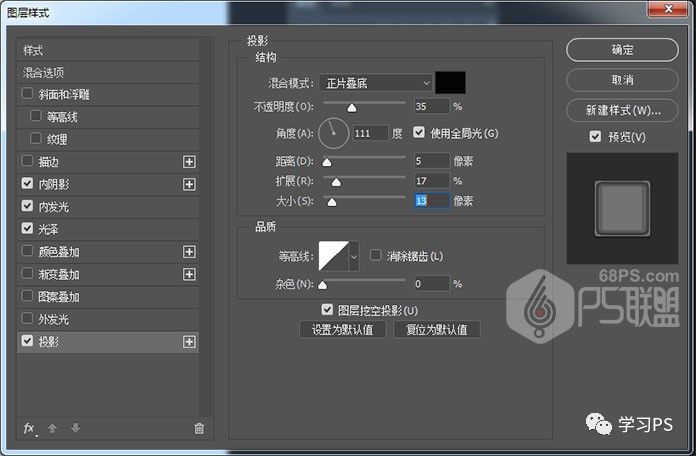 步骤7、给微章添加投影效果,混合模式:正片叠底,不透明度:35%,距离:5,大小:13。