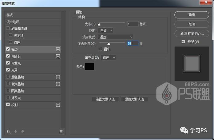 步骤8、给微章进行描边处理,大小:1,不透明度:38%,位置:内部,大小:13,混合模式:叠加。