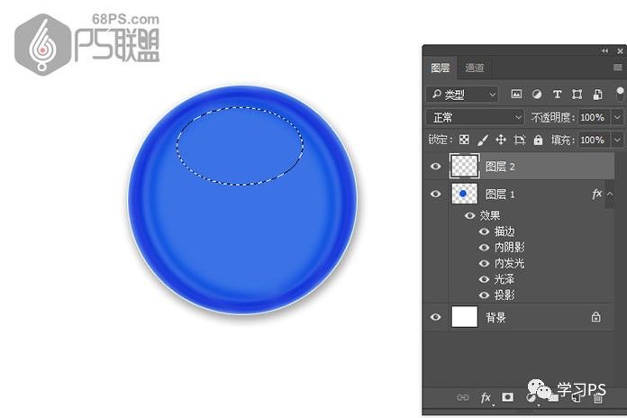 步骤9、先下来我们处理微章的高光部分,转到图层中新建图层2,选椭圆选框工具,在圆上画一个椭圆形。