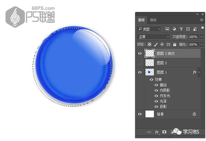 步骤12、接下来我们给微章再加一些小的高光效果。转到图层,复制图层2复到图层2拷贝,把图层2边上的眼睛关闭使图层不可见。按住Ctrl键点击图层1,得到圆形选区,通过键盘上的左键和下键来控制选区,移动到如下图所示的位置,然后点击delete键。