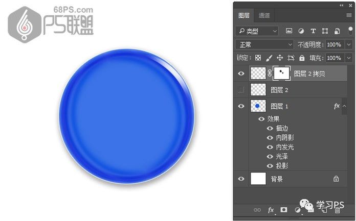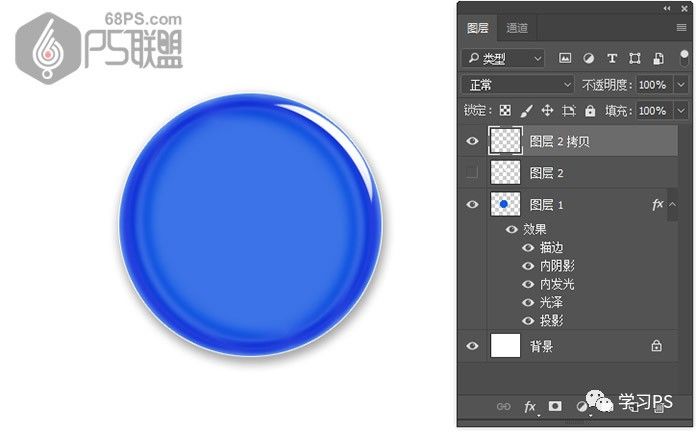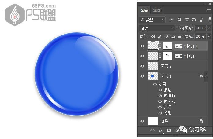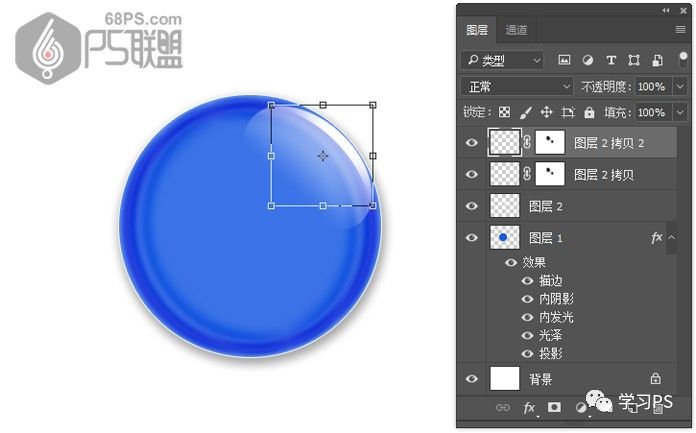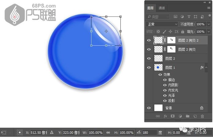 步骤14、打开图层2边上的眼睛,使图层可见。复制图层2拷贝层,得到图层2拷贝2。Ctrl+T选中图层2拷贝2层,把角度设为180度,变换小高光的位子,并移到圆形微章左下角。