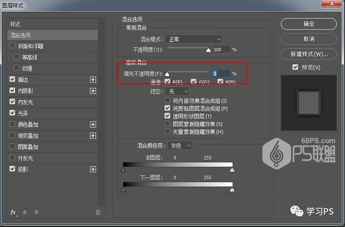 步骤16、由于我们需要做很多款图案的水晶微章,所以要对微章进行透明处理,双击图层1打开图层样式,将混合选项中高级混合填充不透明度设为0,得到如下效果。