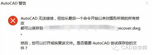 2.会出现cad警告,点击确定,它会保存一个副本为文件名后面加了recover
