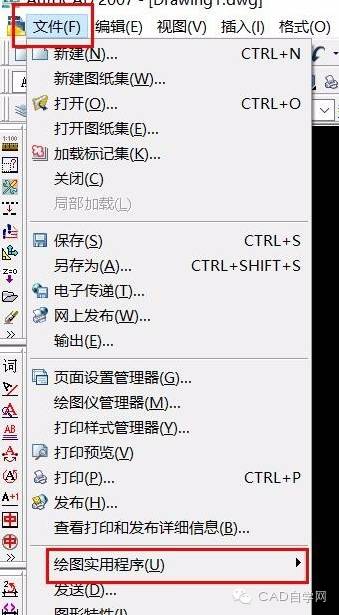 5.直接打开CAD软件,点击文件,鼠标移动到下方的绘图实用程序