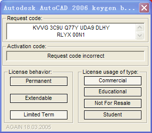 成功安装CAD2006后在最后一步注册的时候,输入申请号后,却提示:请求代码不正确Request code incorrect,如下图: