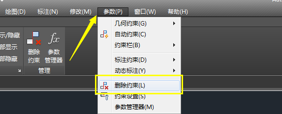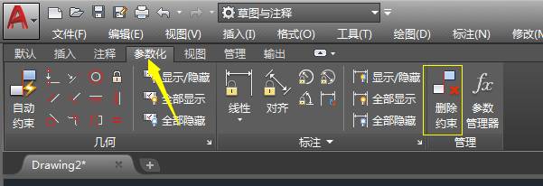第二步、使用删除约束功能删除之前已经添加好的约束、草图与注释界面直接切换到“参数化”选项卡、找到删除约束功能;经典工作空间的用户可以点击“参数”菜单栏、在下方找到删除约束功能、执行命令以后直接框选被约束的图元删除即可(不用担心将图元也删除)