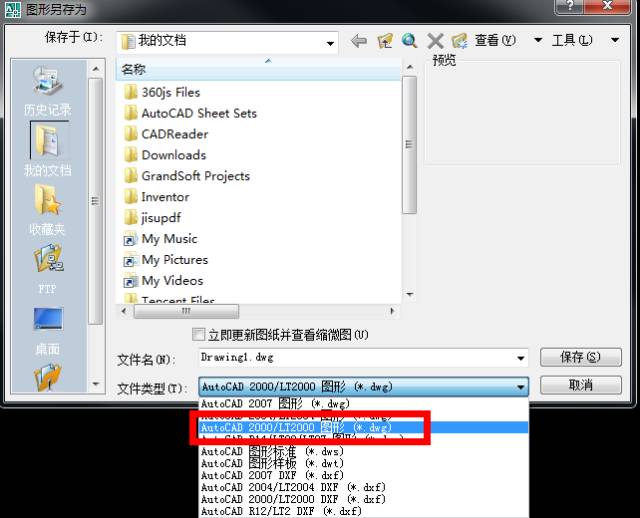 当处理很多方法都不行的时候 。可以将CAD图纸另存为一下,另存的时候将文件类型改为dxf.或者选择AUTO 2000.dwg的格式,如图: