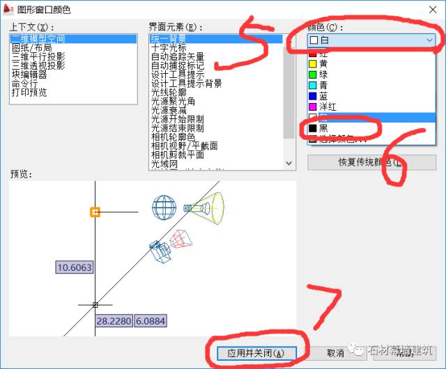 3、选择图纸布局、统一背景颜色,然后在颜色位置换成黑色,点应用关闭即可。
