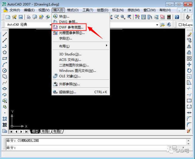 1,打开CAD软件,在工具栏中选择“插入”,选择“DWF参考底图”。