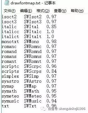 这是SOLIDWORKS与CAD的字体映射文件,共三列,每列之间空格隔开。左起第一列为CAD中字体的名称,第二列为对应的SOLIDWORKS中的名称,第三列为字体缩放比例。