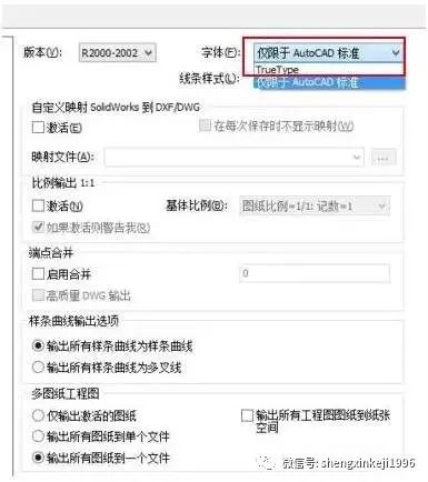 切换到工程图选择另存为,在下拉框中选择dwg格式,然后不要直接点击保存,先点击下方的“选项”按钮,在弹出的对话框中将字体“仅限于AutoCAD标准”改为TrueType,然后确定关闭对话框,点击保存,转换成CAD文件。