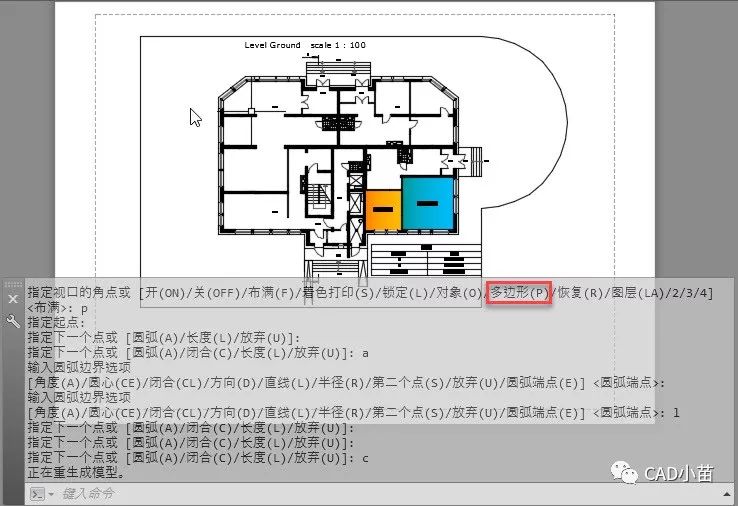 执行MV命令后,输入P选项,就可以直接在布局中绘制一个多边形的视口,绘制多边形的参数与多段线类似,也可以绘制弧线段,最后输入C闭合即可,如下图所示。