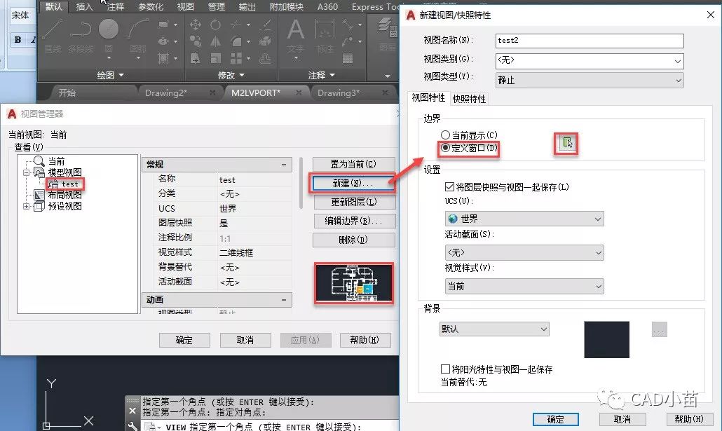 看AUTOCAD2018的帮助中MVIEW命令新建和命名两个选项,利用新建选项应该是可以直接从模型空间设置视图范围然后再创建视口,但我试了几个版本都没有找到这个选项,不知道为什么。