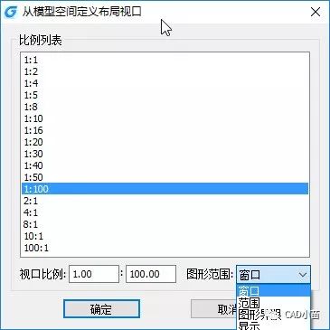 采用默认的窗口形式,选择或输入比例后单击确定关闭对话框,根据提示在模型空间选择好图形范围后,就会自动回布局或选择一个布局后指定视口位置,视口大小是根据设置的比例和选定的图形范围计算出来的,创建后视口直接被锁定,这样一次操作就将视口比例及显示的视图都搞定了,非常简单。