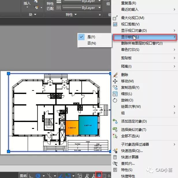 双击进入视口,也就是进入模型空间后缩放图形,随着显示图形范围的变化,视口的比例也会被修改,因此当我们已经设置好视口的比例和视图后,不希望在缩放或平移时改变视口的比例和视图,就需要将视口的显示锁定。MVIEW命令有锁定L参数,不过锁定视口通常不需要执行MV命令,在视口的右键菜单里可以设置,在AUTOCAD和浩辰CAD高版本的状态栏中提供了锁定视口的按钮,选定视口后可以可以直接单击状态栏的锁定视口按钮,如下图所示。