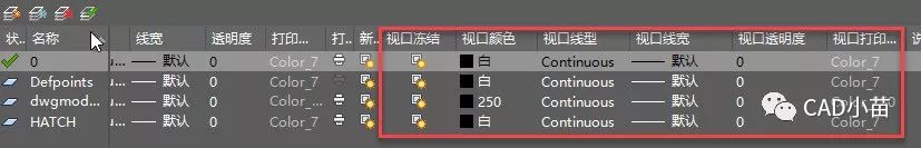 为了让视口显示不同类型的图形,或者同类图形在不同视口中显示成不同效果,CAD提供了针对视口的图层特性控制,比如可以设置在当前视口中冻结图层或在在当前视口图层使用不同的颜色、线型、线宽。进入视口后,打开图层管理器,后面会增加几列控件,如下图所示。