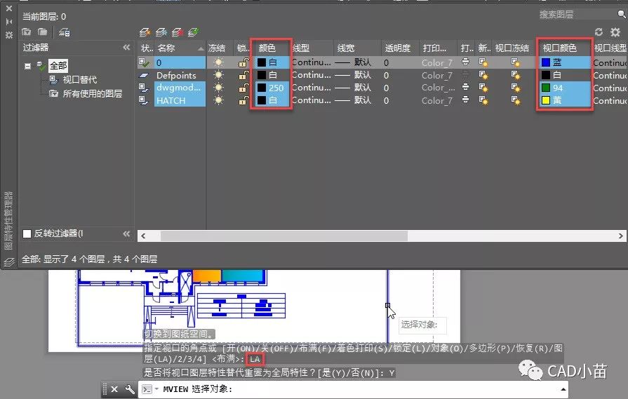 如果当前视口的图层特性经过调整,可以用MV的图层(LA)选项将视口中图层重新恢复成默认设置,也就是跟模型空间设置一致的状况。