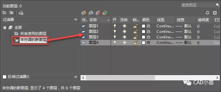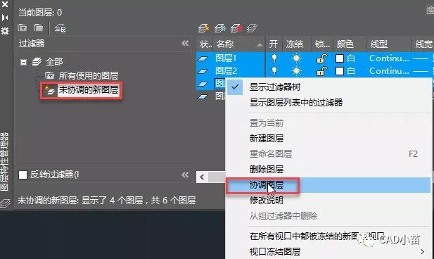 在图层管理器中选择“未协调图层”过滤器,右侧显示的就都是新图层,在右侧列表选择一个或多个图层后,右键,在右键菜单中选择“协调图层”就可以让图层不再是未协调图层,如下图所示。