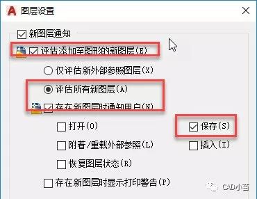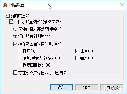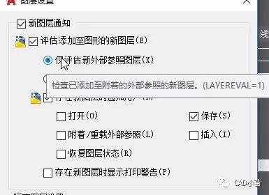 一般情况下我们会勾选“评估添加到图形的新图层”并单选“仅评估外部参照的新图层”,也就是当重载外部参照的时候会检查是否有新图层。