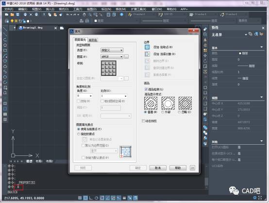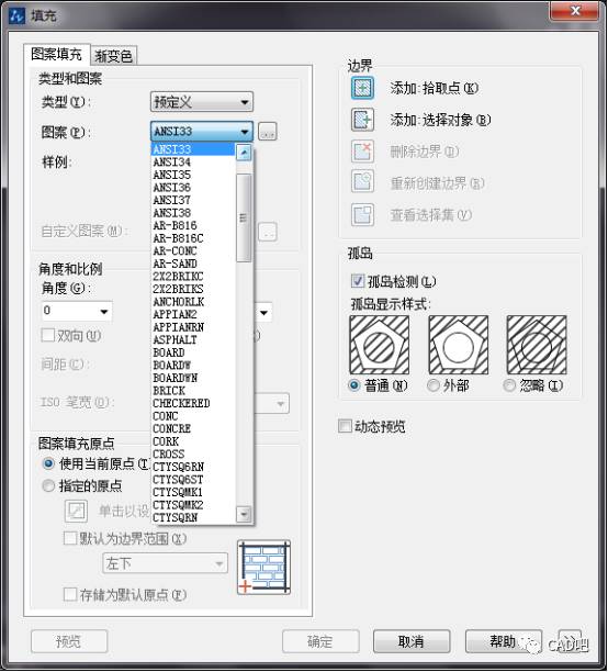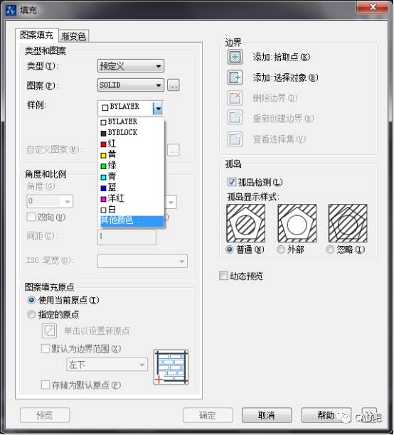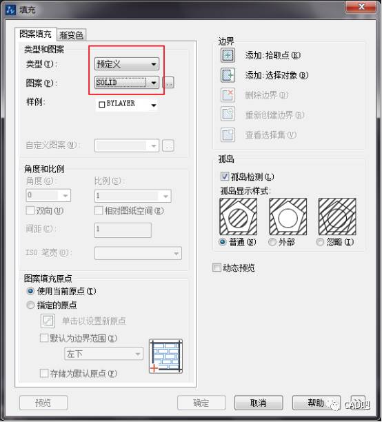 单击图案那一栏的倒三角符号,可以看到有很多种图案可以选择。把类型设置为预定义,然后选择一个图案【SOLID】。