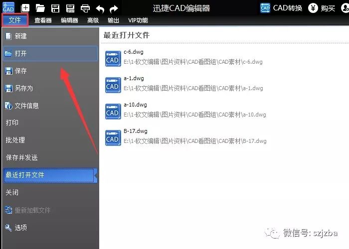 2.在迅捷CAD编辑器界面左上角点击“文件”,然后在文件列表中点击“打开”。