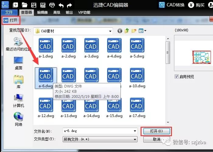 3.在弹出的对话框中,找到我们需要打开的CAD文件,并在对话框右下角点击“打开”,即可在迅捷CAD编辑器中打开CAD图纸文件。