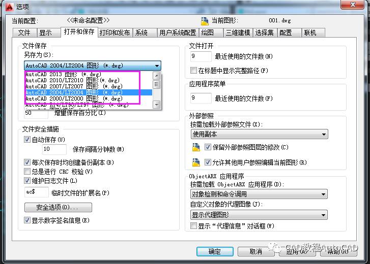 最好的方法还是安装CAD后在选项里把保存时的版本设置为低一点的版本,如下图: