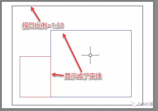 切换到布局空间,直接用默认视口,将视口比例也设置成1:50, 果然跟他们说的一样,虚线变成了实线!如下图所示。
