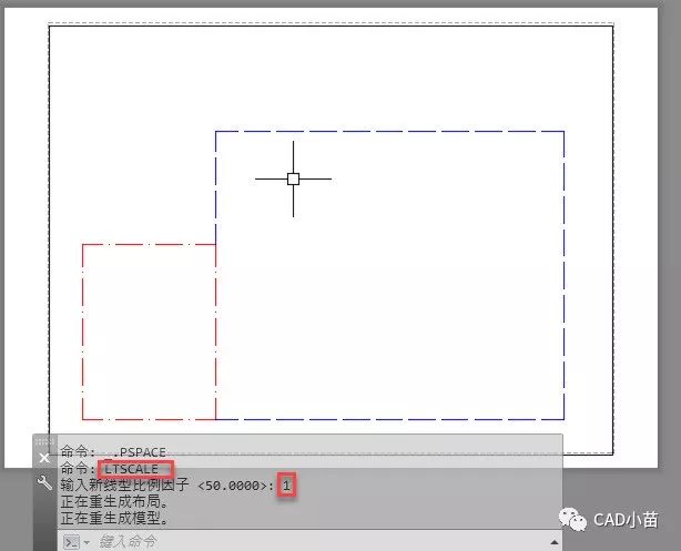 既然视口已经通过比例将图形缩小了50倍,我们就不需要将线型比例设置成50了,将线型比例LTSCALE改成1就好了。