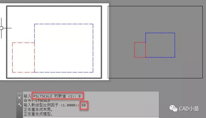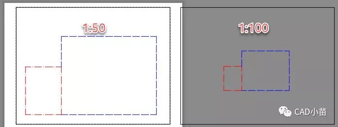 我们再来看看为什么CAD要这么做,复制一个视口到一旁,将新视口比例设置为1:100,双击进入新口,输入RE回车,刷新一下显示。视口刷新后两个视口中线型显示的效果如下图所示。