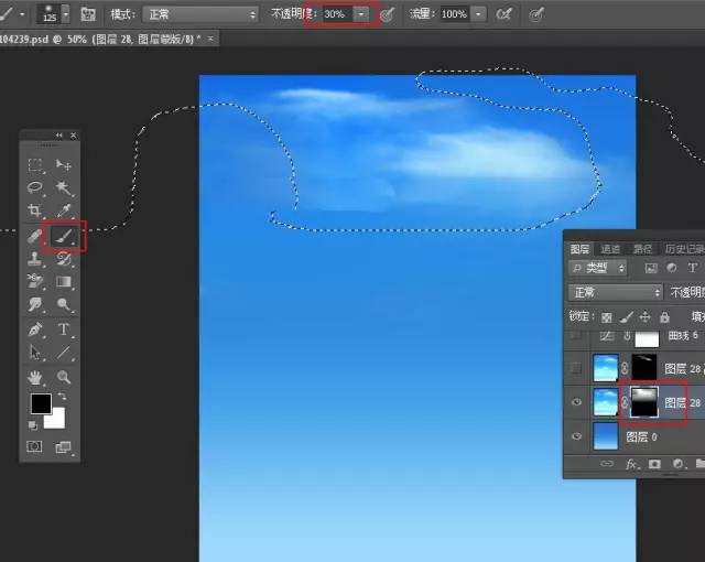 5、添加图层蒙版,把前景色设置为黑色,选择画笔工具,画笔不透明度设置为30%,然后用画笔把云朵以外的区域涂掉,如下图。