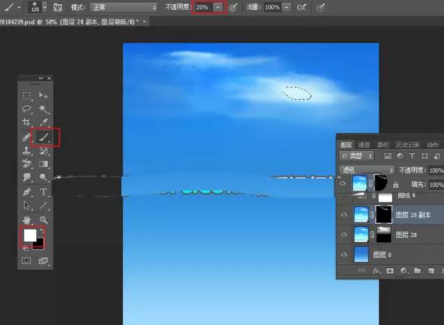 7、把前景色设置为白色,然后选择画笔工具,画笔不透明度设置为20%,然后把云朵中间区域涂亮一点,如下图。