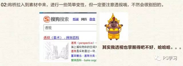 | 2、将桥拉入到素材中来,进行一些简单变形,但一定要注意透视哦,不然会很别扭的。 |