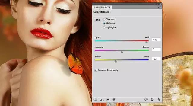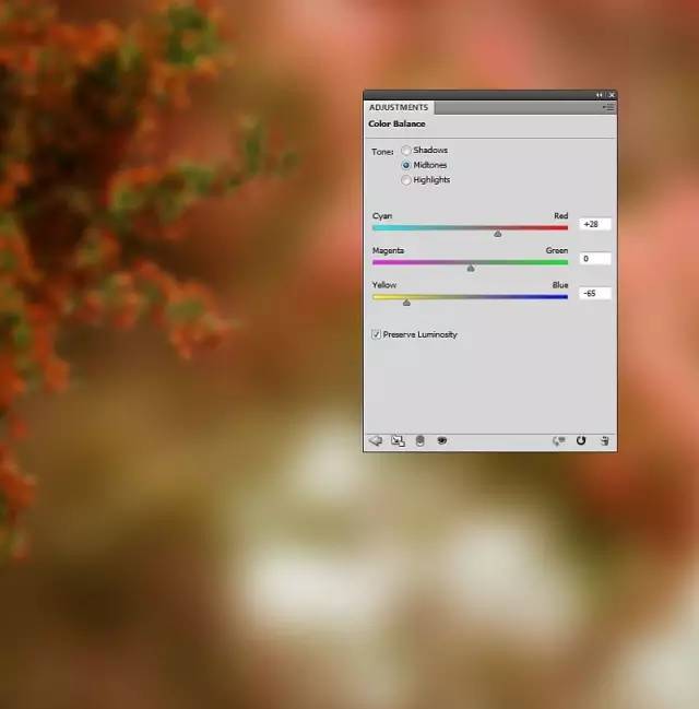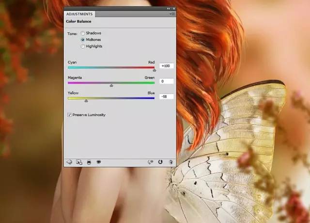 做一个色彩平衡的层调整图层。更改中间调的设置: