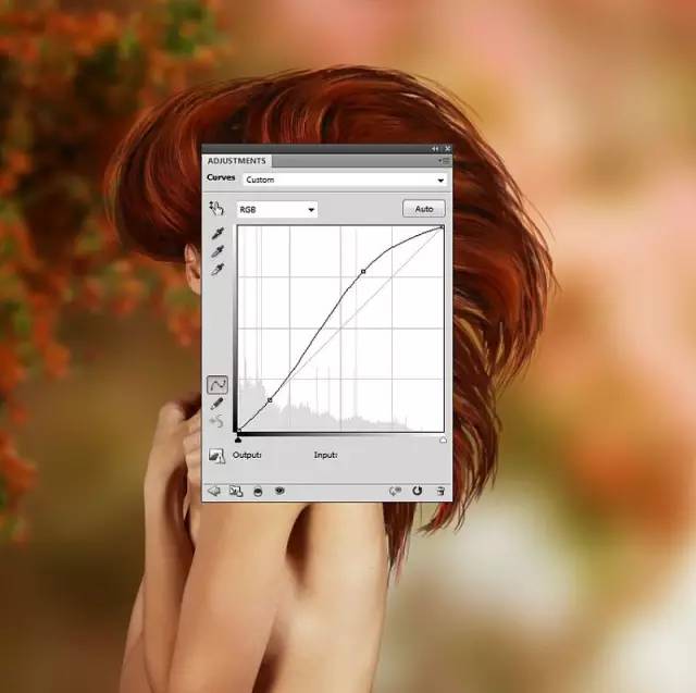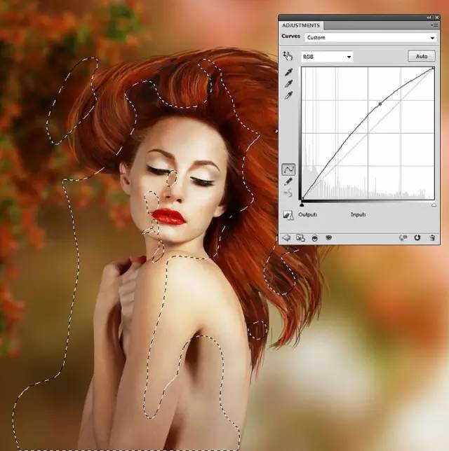 做一个 曲线调整层,以增加光线和模特的对比。模特上的灯来自右侧,在上半身更加明显。使用柔软的黑色刷子来改善模型上的光线和阴影,使光线在肩膀,脸颊和头发上更强。