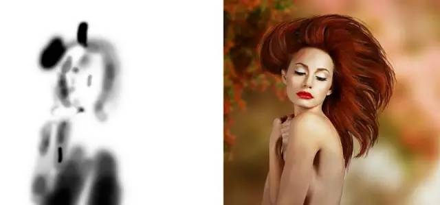 使用柔软的黑色刷子露出头发,使其覆盖翅膀。还将翅膀的下半部分与模特的背部融为一体。