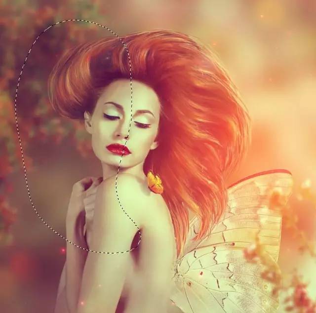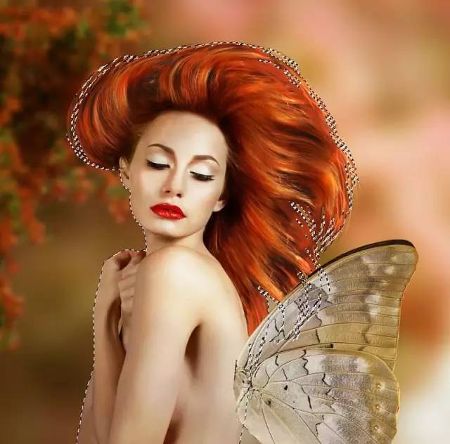 打开蝴蝶1图像。只选择翅膀,将它们放在模特的背部。