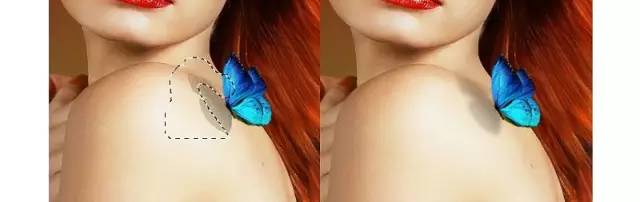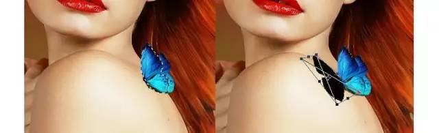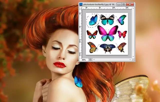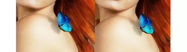 打开蝴蝶2图像。拿上左上方的蓝色蝴蝶,把它放在模特的肩膀上,以配合她的凝视方向。